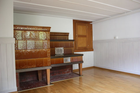 Die Wohnung ist einfach gehalten. Die Heizung ist an unserer Wärmepumpe angeschlossen. Die Küche hat einen Elektroherd und verfügt zusätzlich über einen Tiba Holzherd. Der Holzbackofen sowie die Kunst sind funktionstüchtig und können eingefeuert werden. Die Wohnung ist auf zwei Stöcke verteilt. Unten Wohnraum, Küche und Dusche. Oben drei Zimmer und Badezimmer mit Badewanne. Die Böden sind alte, eingeölte Tannenböden.